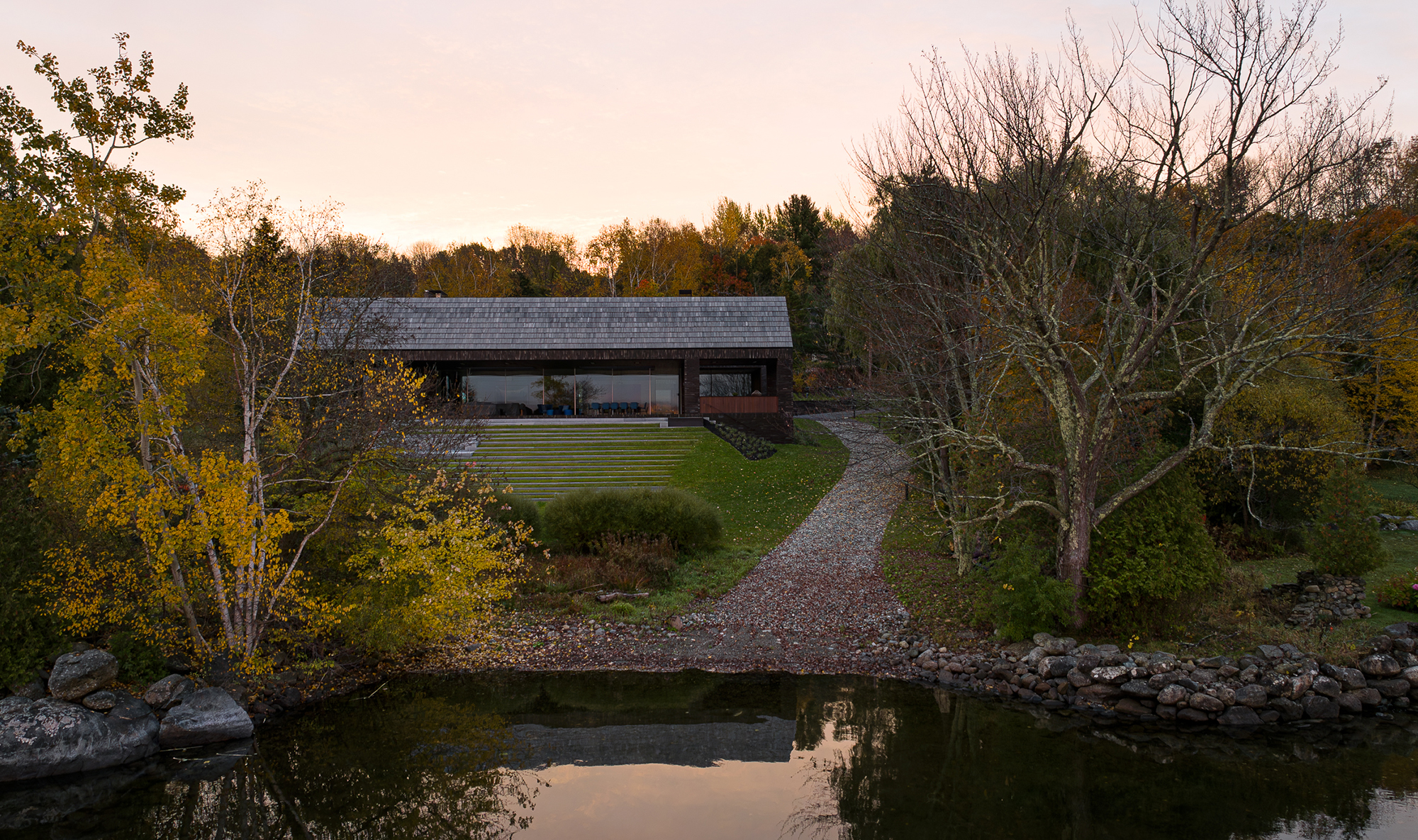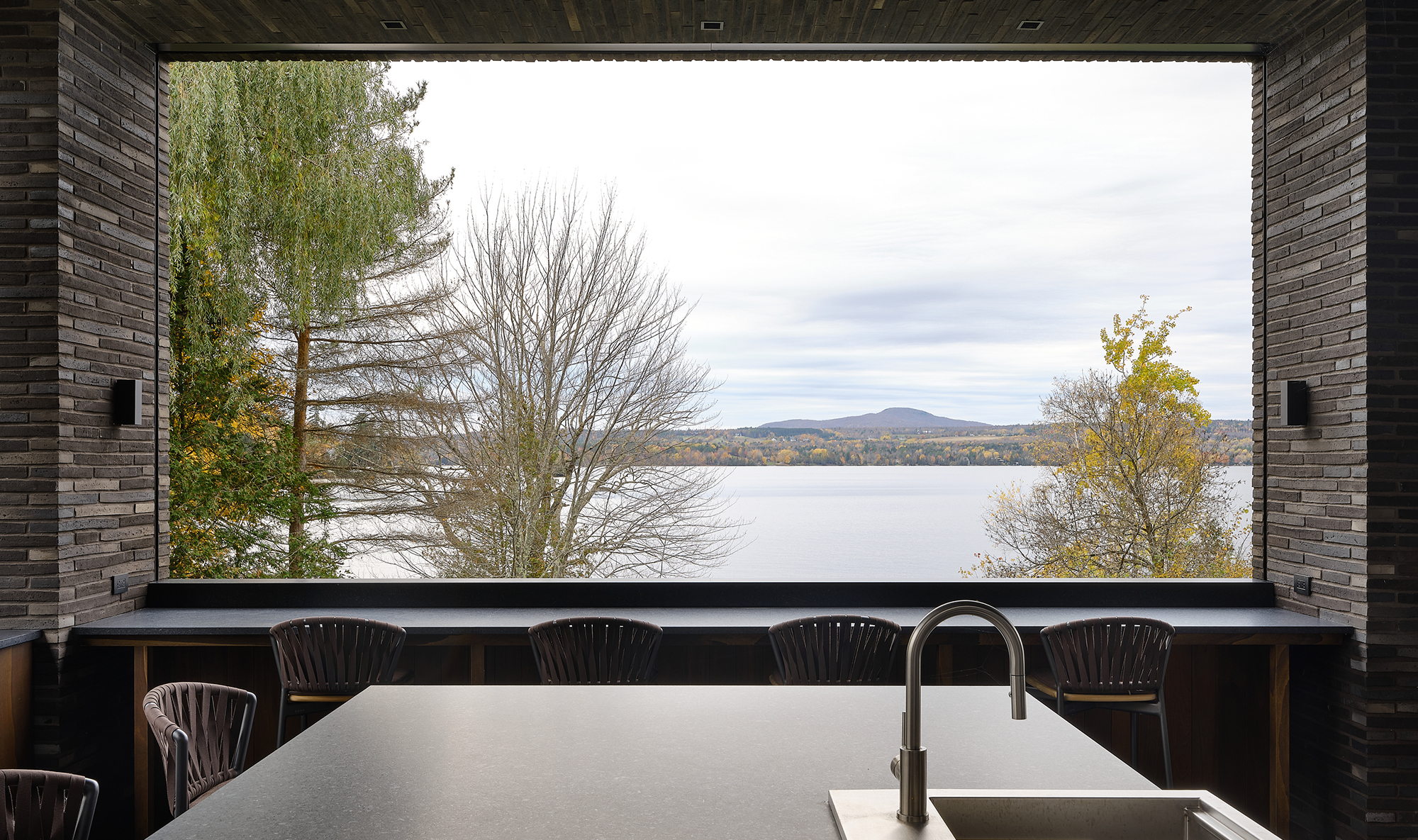 Det canadiske byggeprojekt kombinerer armeret beton, stålkonstruktion og murstensvægge i en elegant struktur. Et innovativt strukturelt system muliggør brugen af glaspartier på over 15 meter, hvilket giver en uforstyrret udsigt over Lake Memphremagog og den omgivende natur.