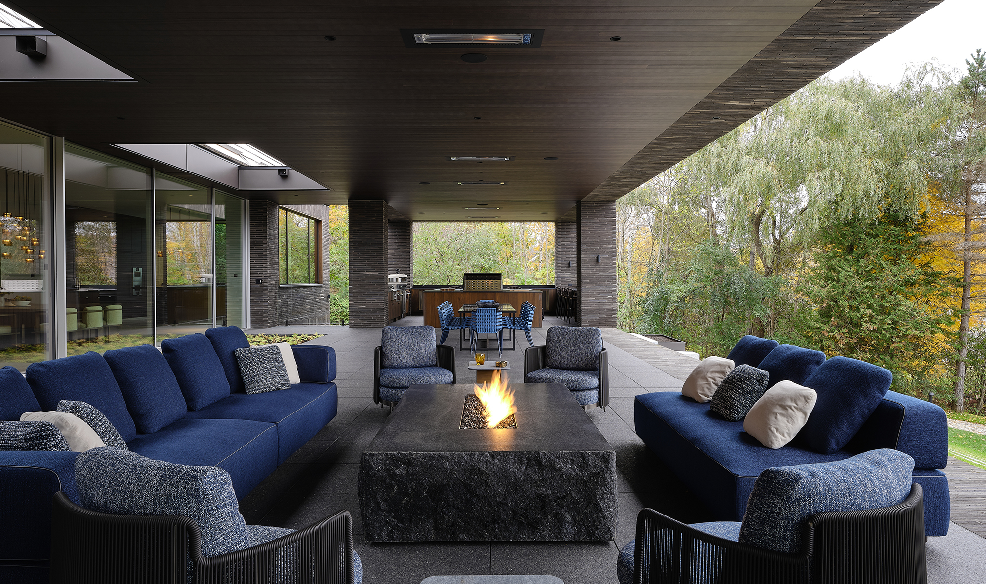 De nøje udvalgte naturmaterialer, både indvendigt og udvendigt, er designet til at udvikle en patina over tid, som afspejler årenes gang. Ydervæggene er opført i ULTIMA RT 151 langformat mursten. De overdimensionerede tagbjælker blev specialfremstillet i et lokalt værksted, mens murværket på terrassen, haven, udendørskøkkenet og pejsen består af en blanding af lokalt udvundne sorte og grå Cambrian granitsten. Indvendigt har køkkenøen en solid stenblok med en flammebehandlet valnøddetræsbordplade og naturlig, levende kant, som skaber en stilfuld barhøjde.