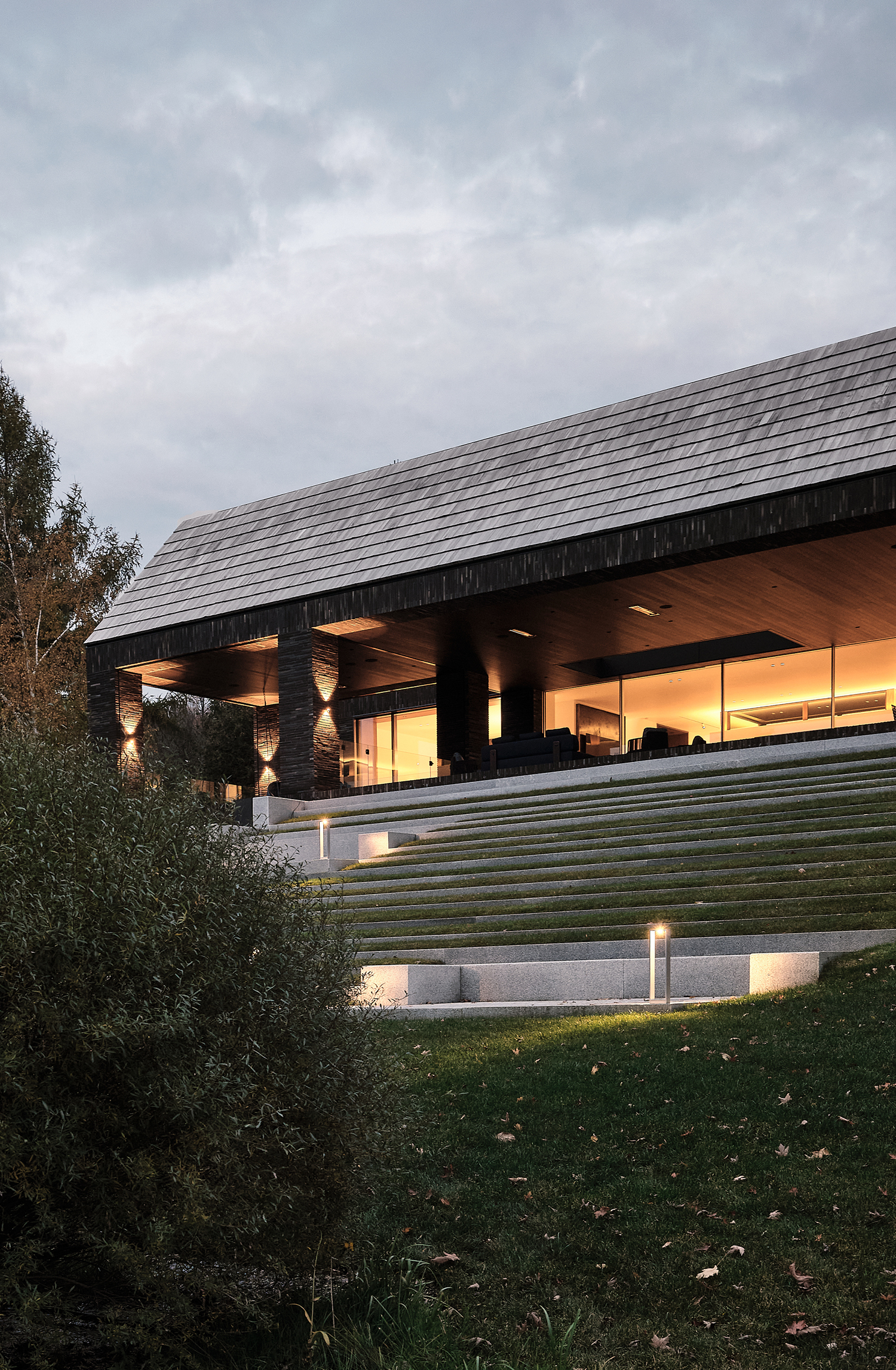 The four building forms, each with specific functionality, are connected by glass bridges that seem to hover above the ground. The summer house by the lakeshore features a 30-meter-long terrace with an outdoor kitchen, dining area, fireplace lounge, and heated pool. The winter house is designed as an open space that combines a kitchen, dining area, lounge, and piano bar. The living area houses the master suite, an office, a wine cellar, and a pantry. The guest quarter, located farthest from the lake, offers five bedrooms and a children's room.
