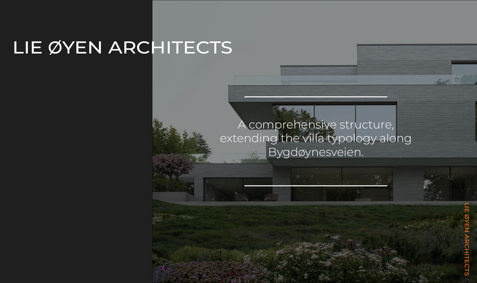 LIE ØYEN Arkitekter har tegnet en imponerende forlængelse af villatypologien langs Bygdøynesveien. Placeringen af villaerne giver ekstraordinære sol- og naturskønne forhold for alle lejligheder, og tilbyder privatliv væk fra vej og naboer. Bygdøynesveien imponerer alle med sine store udendørs områder, der byder på uovertruffen udsigt.Lie Øyen arkitekter, grundlagt af Tanja Lie og Kristoffer Øyen, består af 12 medlemmer (13 inklusive hunden Lucy), og er kendetegnet ved deres interesse i at overbygge kløften mellem urbanisme og den omhyggelige skabelse af små elementer.