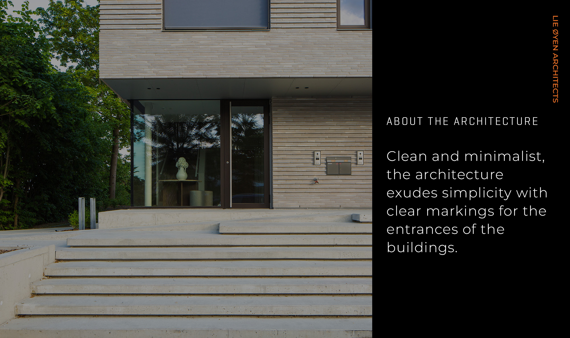 Med sit rene og minimalistiske design udstråler arkitekturen enkelhed med tydelige markeringer for indgangene til bygningerne. Generøse altaner er som om de er ”udskåret” direkte fra bygningsmassen selv, og på nogle steder, fremspringende ved hjælp af murstensbjælker for at skabe beskyttede og solrige udendørs områder. Bygning A har private indgange og trapper, mens Bygning B, der strækker sig over fire etager, har en fælles indgang med et delt repræsentativt trappehus.