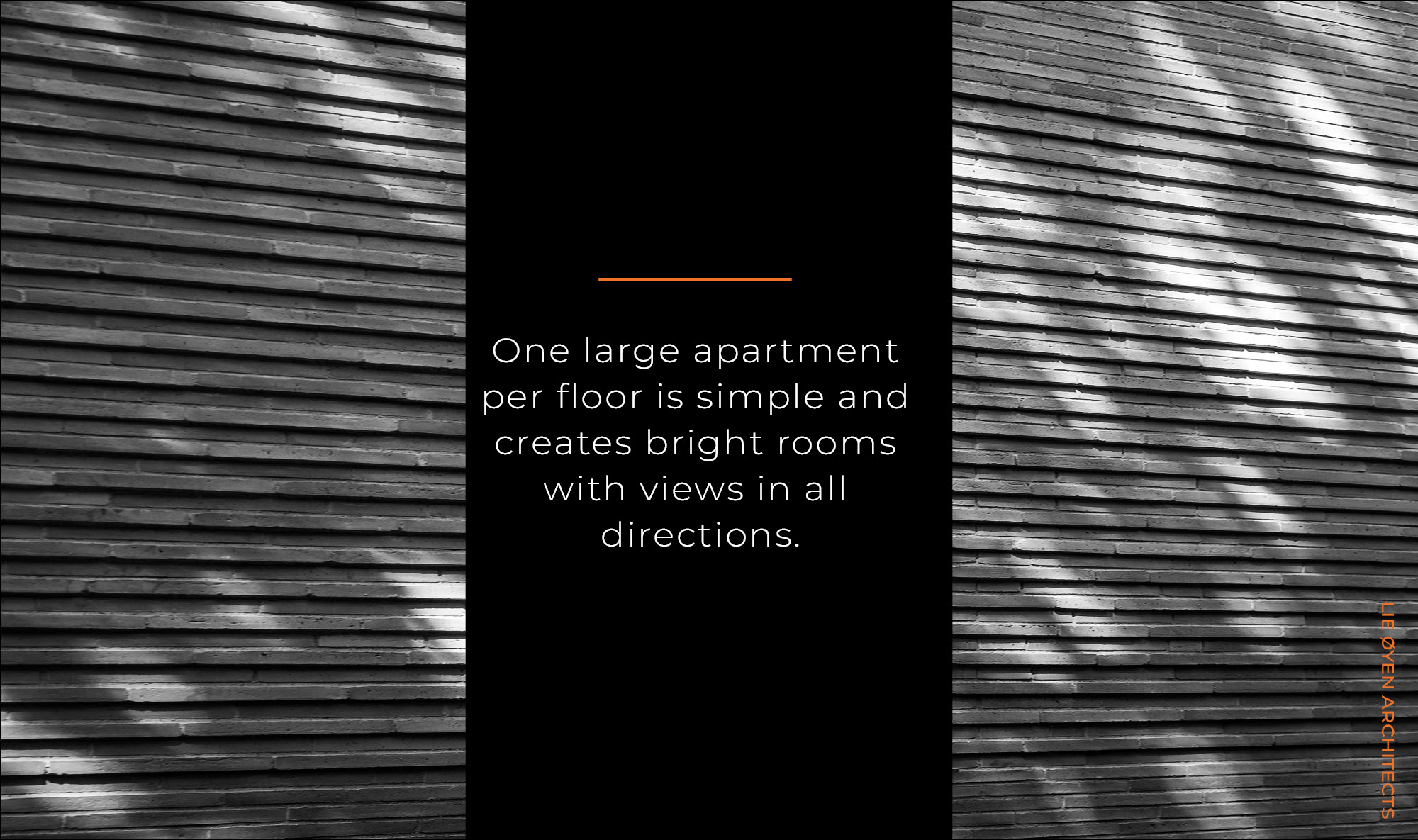 Konceptet med én stor lejlighed per etage er simpelt og tilbyder lyse rum med udsigt i alle retninger. Trapper og elevatorer er planlagt således, at alle lejligheder har den bedst mulige forbindelse mellem hovedetagen, tagterrasserne, indgangen, privat garage og yderligere rum.